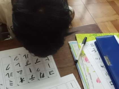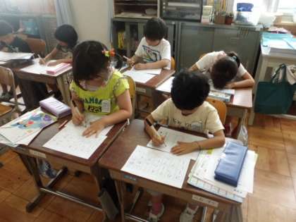 今日の書写の時間は,画の終わりと途中の書き方に気をつけて片仮名を書く学習でした。きちんとお手本通りに書けているかを確かめるため,今日は「魔法のメガネ」を使いました。自分の書いた文字に「魔法のメガネ」(透明シートにお手本の文字が書かれたもの)を重ね合わせます。正しく書けた文字ともうあと一歩の文字を自分で見つけることができました。確かめた後は,またそれぞれの課題に合わせて練習をします。次の時間は清書です。もっと美しい文字が書けるといいなと思います。