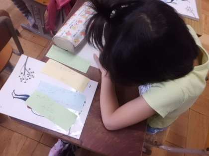 昨日観察した生きものの様子を観察記録文に書きます。昨日書いた色の短冊を並べ替えて,構成を考えます。こちらも2回目なので,すいすい書くことができました。題名もいろいろ工夫されていて楽しい感じが伝わります。