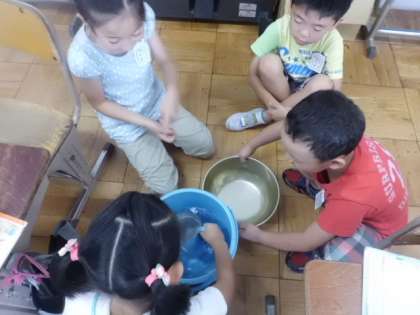 昨日,時間切れになったかさ調べ。今日はたっぷり一時間取り組みました。やかん,なべ,水槽,水筒…水を入れていろいろな入れ物のかさを調べました。「やかんは10Lも入っていたよ!」「水筒は1Lと少しだ。」と班で協力して調べることができました。