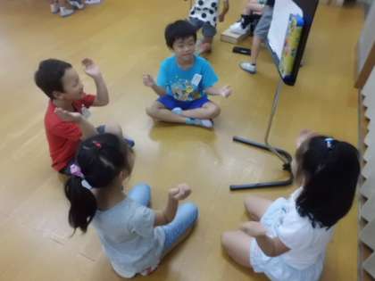 前回の授業から作り始めたオリジナルラップ。今日も話し合いは続きました。前回いろいろなものと音をつなげて考えていたので,だれから始めるか,どんな順番にするかを決めました。グループで何度も試しながら考えるのは楽しい作業のようで,みんなニコニコ。次回の発表会が楽しみです。