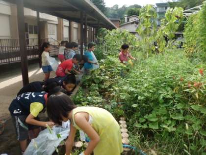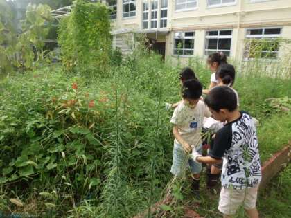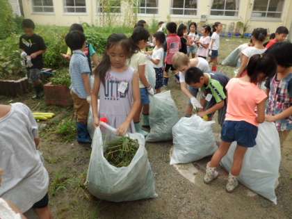 野菜を育てていた花壇の草ひきをしに行きました。行ってみると花壇だけでなく,その周辺も草がボーボー!!今年は雨が多かったので,雑草もよく育ったようです。子どもたちは気合満々で草ひきをスタート!太い草はみんなで力を合わせて,「うんとこしょ,どっこいしょ。」と「大きなかぶ」のように引っ張ります。あっと言う間にゴミ袋がいっぱいになりました。わずか20分程の時間で,10袋以上の草をとってくれました。子どもたちのパワーはすごいですね。ご苦労様でした。ありがとう!