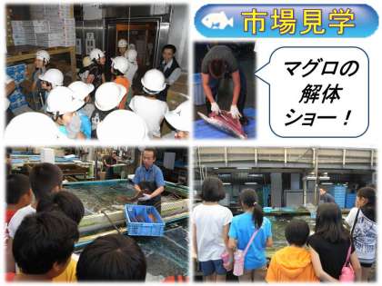 2組の市場見学でも,ちりめんじゃこを試食させていただいたり,いけすの中を見せていただいたりしました。また,マグロの解体ショーも見せていただき,大きな包丁を使いこなす職人さんの技術に,担任共々驚きました。どんどん切り落とされるマグロの身がとてもおいしそう。