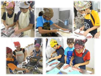 調理実習では,板前さんに教えていただきながらがんばりました。出来上がった料理は,とてもおいしかったです。