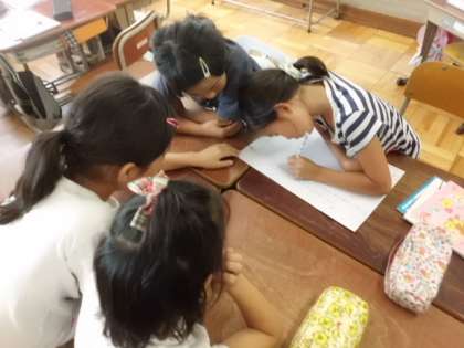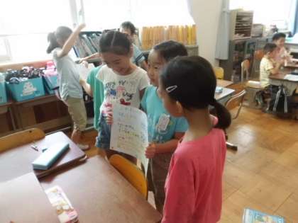 先週作った「ふれあいの日」のお知らせ用のポスターを基に,それぞれの教室に行って内容などを知らせる練習をしました。原稿を作り,それをだいたい覚え,大きな声ではっきり伝える,これだけのことがたった1時間できちんとできました。さすが2年生です!!