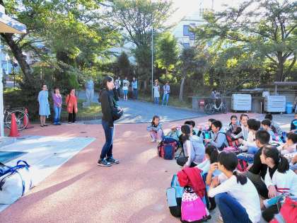 今日は秋分の日。5年生の長期宿泊学習,出発の日です。たくさんのお家の方の見送りをうけて,出発式です。