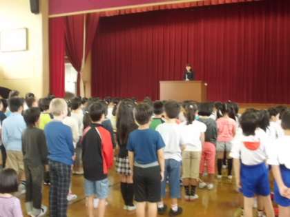 今日で前期も終了になります。2年生も残り半分になりました。校長先生のお話を聞きながらこの半年を振り返りました。お話の間,子どもたちはみんなじっと立ってお話を聞いています。その姿に半年の成長を感じました。