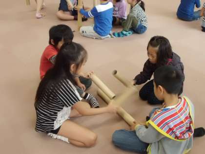 どの班もみんなで話し合いながら,筒と筒で楽しい音を見つけることができました。