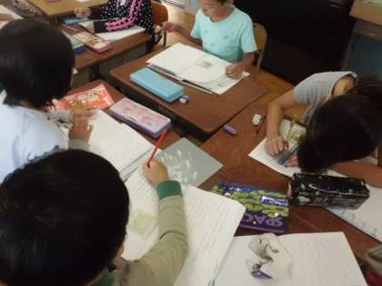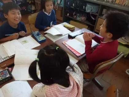 国語科「お手紙」の学習で音読劇に取り組みます。今日はそのために,読みたい場面,役割,読み方の工夫を班で話し合って決めました。劇なのでもちろん動作も入れます。早速,身振り手振りをつけながら読み始めているグループもありました。