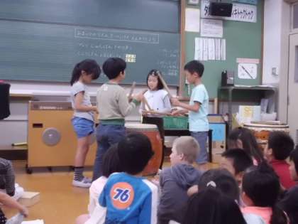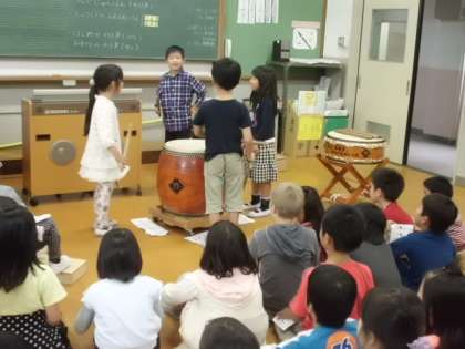 芸術鑑賞会で演奏を聞かせていただいたすぐ後は,ちょうど音楽の授業でした。今日はこれまでに練習してきたお祭りの音楽を発表します。太鼓とかけ声を組み合わせてグループごとに発表しました。ひとりひとりが考えた太鼓のリズムやかけ声以外にもグループで考えたものがつけたされてさらに迫力十分!!午前中のプロの演奏にも負けない?!素晴らしい発表をしたグループもありました。
