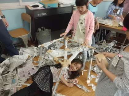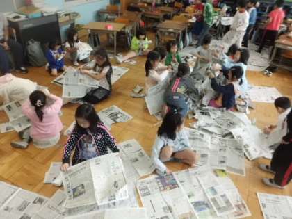 新聞紙を使って造形遊びをしました。「新聞紙を使って自由に遊んでいいよ。」と伝えると子どもたちは大喜び!!思いっきり破いて紙吹雪やクッションにして遊んだり,ガムテープで貼り合わせて服や帽子,靴,かばんを作ったり,机に新聞紙をつなげておうちを作ったり…いろいろ考えて思い思いに遊んでいました。最後はみんなで大掃除。一枚も残さずに袋に詰めました。来週はこの新聞紙を好きな袋につめ,かわいい生きものを作ります。