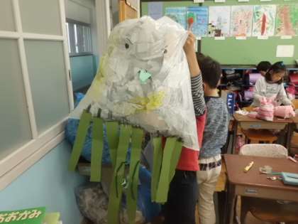 真ん中の作品は「ダイオウイカ」です。45Lのゴミ袋いっぱいに新聞紙を詰めて作ったので,作った本人が隠れてしまうぐらい大きな作品に仕上がりました。