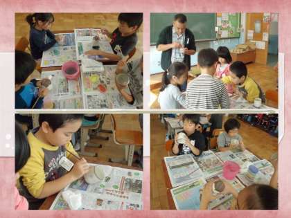 清水焼の絵付け体験のために,講師の方が来てくださいました。みんな大喜びで「どんな絵にしようかな?」と悩みながらも素敵な絵を描いていました。みんな焼き上がるのをとても楽しみにしていました。