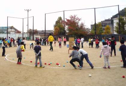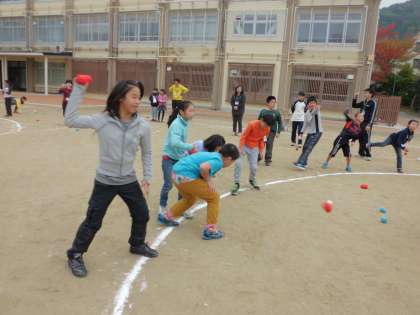 曇り空で寒そうにしていた子どもたちも,全力で玉を投げているうちに体が温まったようです。