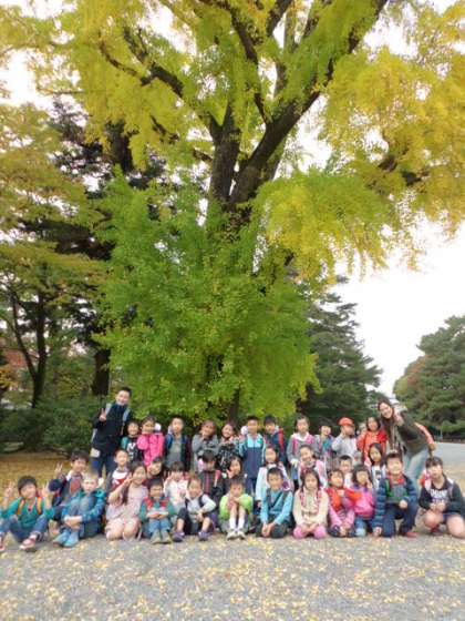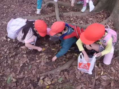 京都御苑では,グループごとに分かれて秋見つけビンゴと秋のもの(どんぐりや松ぼっくりなど)拾いをしました。「うわぁ!ここにどんぐりがいっぱい落ちているよ。」「きれいな色の葉っぱだな。」「どんぐりの帽子もたくさん見つけたよ。」と1・2年生でたくさんお話しながら回りました。