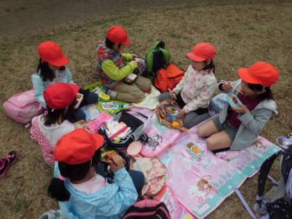 その後は,色づき始めた木々の前で記念写真を撮り,いよいよお楽しみのお弁当タイムです。こちらも1・2年生一緒にいただきました。このころにはずいぶん打ち解けた様子で,お弁当の中身をみんなで見せ合っていました。お弁当のあとも短い時間でしたが一緒に遊び,とっても仲良くなって帰ってきました。