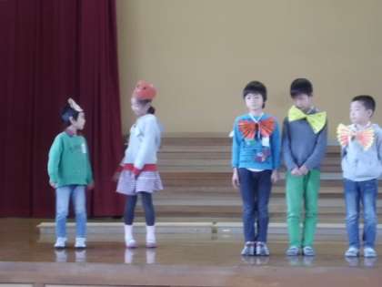 今日の学習発表会の練習では,先日作った小道具を身につけて練習しました。ちょっとした違いですが,ぐっと雰囲気が出ていました。演技にも熱が入ってきており,あとは細かいところを詰めていく練習になりそうです。
