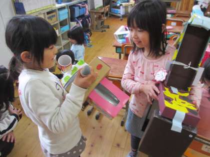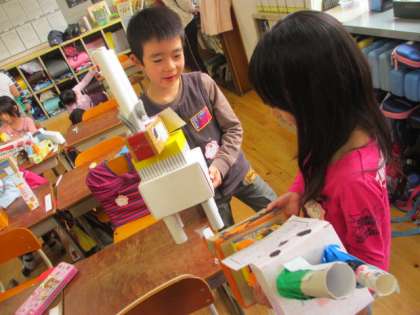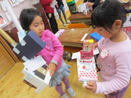いろいろな箱を組み合わせて,楽しい仲間を作りました。