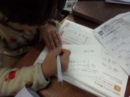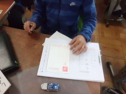 書写で年賀状の書き方を学習しています。まずはおうちの方に書いてもらったメモを見ながら書写ノートに下書きです。でも慣れないからか,下書きの段階ですでに悪戦苦闘。難しい漢字があったり,書くことが多かったり大変だったようです。