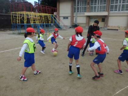 ボールけりゲームの学習も今日で一旦終わりです。みんな随分上手に蹴ることができるようになりました。ボールがコートの外に出てしまった時,「ぼくが出してしまったから,相手チームからスタートだよ。」と正直に伝える姿が見られました。勝ちたいのはみんな同じ。でも,公平な目で判断することはとても大切なことです。上手にプレーをすることができるようになったのもうれしいけれど,そんな姿もすてきだなと感じた今日の授業でした。