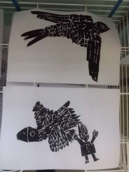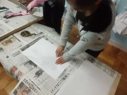 ようやく完成した鳥の版画。早速インクをつけて刷ってみました。よーくこすると,出てきました!美しい鳥の姿が!!羽も一枚一枚きれいに出ています。まだ版ができていない子たちも完成した子の作品を見て感動していました。みんなの作品が出来上がるのが楽しみですね。