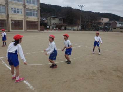 今日の体育では,大縄を使って「郵便屋さん」に挑戦しました。「1まい,2まい,3まい…」と歌いながらまわしていくのですが,なかなか「10まい,ありがとさん!」まではたどり着けません。でも,みんな引っかかっても楽しそうに跳んでいました。見ている方も,子どものころを思い出す楽しい遊びです。