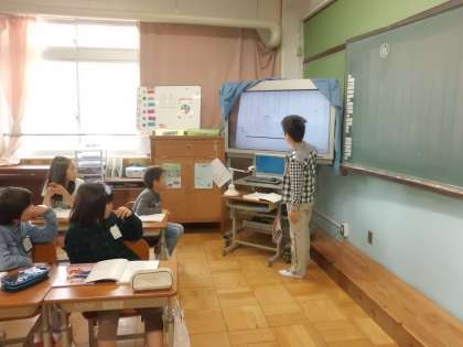 自分のノートをテレビに映し出して,みんなに説明しています。