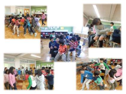 イス取りゲームで大盛り上がり!!空いているイスを,必死で教えてあげている姿がたくさん見られました。
