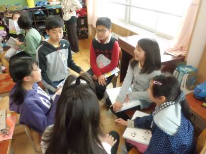 国語科の学習でグループで輪になって座り,隣の友だちが言った文章に合うように物語を作るという学習をしました。子どもたちは「もっとやりたい!」「他のグループの物語も聞きたい!」と楽しんでいました。