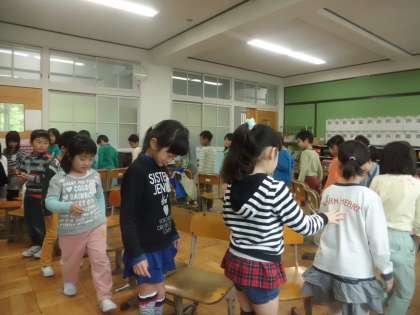 今日のみんな遊びも,雨のため教室での実施となりました。今回は「いすとりゲーム」です。すぐにいすをとられてしまった子たちも音楽を流す係として活躍してくれました。