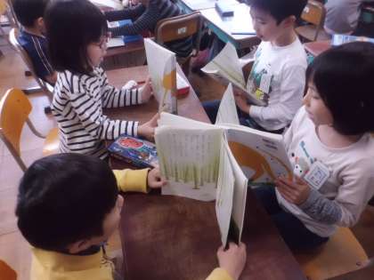国語の教材「ふきのとう」の音読の工夫をみんなで考えています。「ここは○○さん読んでな。」「ここは,『小さな声で』と書いてあるから優しい声で読もうね。」「最後はみんなで読もう!」などいろいろな意見を出し合っていました。早く終わったグループはしっかり練習もできました。