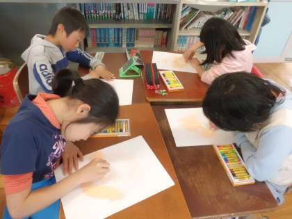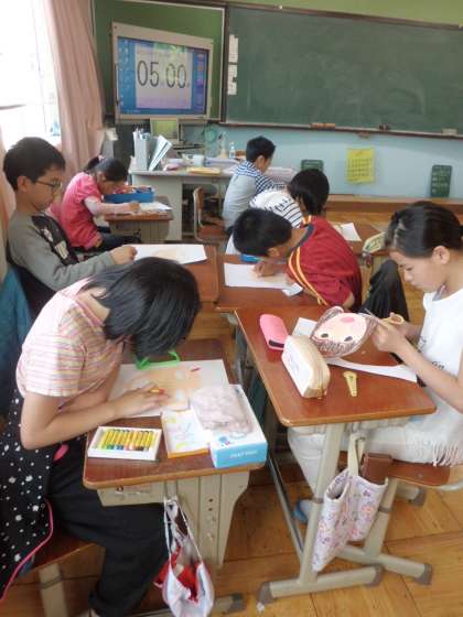 自分の顔を鏡で見ながら,一生懸命描いていました。友達とお互いの目を見て,「白目と黒目・・・・茶色い部分もある。」と,普段あまり見ないところまで見合っていました。全員の顔を掲示板に貼った時,「私の,ぼくの顔はどれでしょう?」と当て合いをしていました。