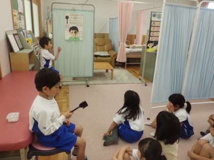 視力検査がありました。目を隠す道具が新しくなったことに早速気づいた子どもたち。上手に片目を隠して検査ができたかな。