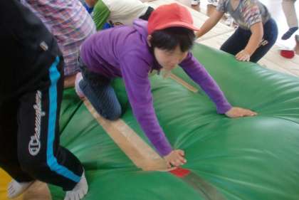 今年度は新たにエアーマットを使って遊ぶコーナーができ,子どもたちも興味津津。楽しそうなマットに飛び乗りたい気持ちを抑えながら,順番を守って遊びました。
