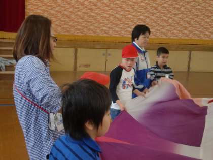 コーナー遊びの後は,みんなで大きな風呂敷バルーンで気持ち良い風を感じながら,左京南支部のお友達との一体感を感じました。