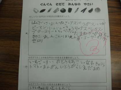 2年生は生活科の学習で野菜を育てます。今日はみんなで知っている野菜集めをして,その中から育てたい野菜を選びました。投票の結果,とうもろこし,スイカ,きゅうり,えだまめ,トマト,さつまいもなどが人気のようでした。連休明けには種まき,苗植えをしたいと思います。お楽しみに!!