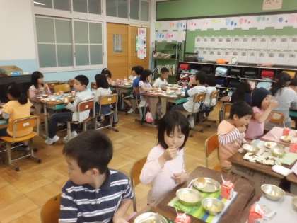 2年生になって,最初の席替えをしました。新しい班で早速給食!とっても楽しそうです。