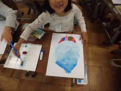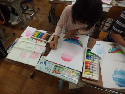 3回目の絵の具の学習は,「おいしいかき氷」を描きました。絵の具と水の量を調整して,シロップの多いところ・少ないところを表現しました。パスで描いた器やスプーン,果物なども加わってとってもおいしそうなかき氷が描けました。これからの季節,教室に飾っておくことで少しは涼しさを感じることができるかも?