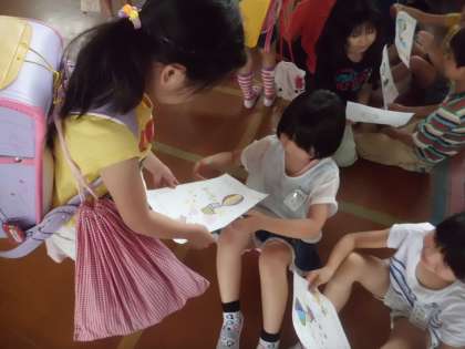 6時間目の初めに体育館で学習していると,ランドセルを背負った1年生がやってきました。そして,2年生のもとに届けてくれたのは…学校探検のお礼のお手紙でした!!とっても嬉しそうに受け取る子どもたち。1年生も是非今日中に感謝の気持ちを伝えたいということで,急遽帰る前に来てくれたそうです。大事にしたいですね。