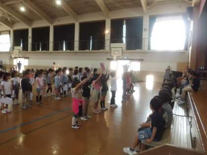 いよいよ練習しきた歌とお迎えの言葉を披露する日がやってきました。2年生の発表は一番。緊張していたようですが,練習通りしっかりと発表することができました。「にじ」は幼稚園や保育園・保育所で歌ったことがある子もいたようで,1年生も「知ってる!!」と嬉しそうに聴いてくれました。