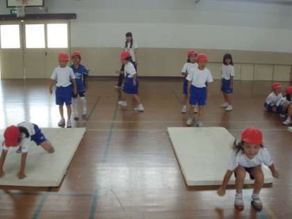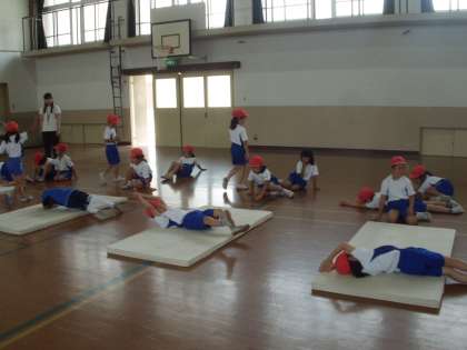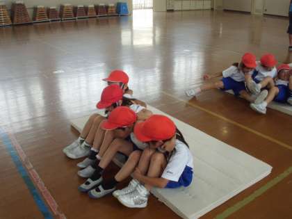 マット遊びの学習を始めました。初めはウォーミングアップをしながら,昨年度の学習を思い出しました。みんな上手にコロコロ転がったりぴょんぴょん跳んだりできていました。次は2年生で初めて登場する技にも挑戦です。