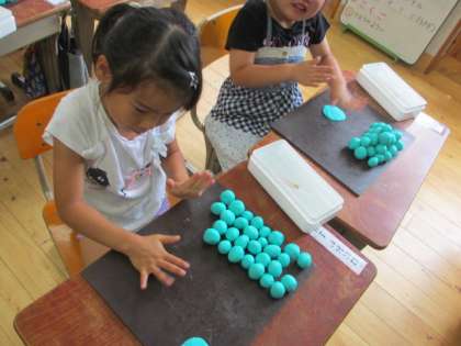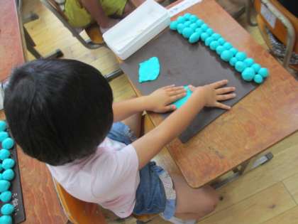 粘土をおだんごの大きさにちぎって,丸めていきます。