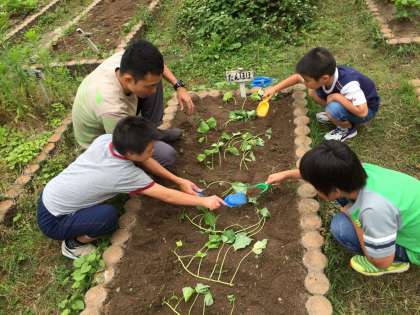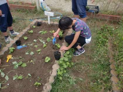 また,5月の参観の時に植えたゴーヤも大きくなってきたので,ポットから畑に移しました。