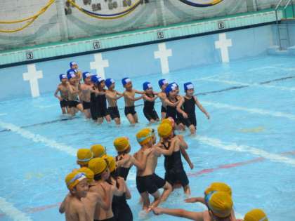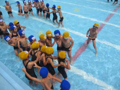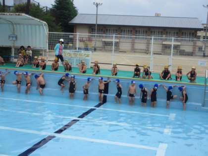 水着に着替えて,体操をして,プールサイドへ。