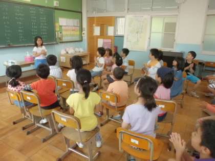 2拍子のリズムに乗せて,動物の名前と鳴き声を交互に言っていく「動物ラップ」をして遊びました。2拍子というのは決まっているので,「ニワトリ」「コケコッコー」のような文字数の多いものはリズムに乗せるのが大変です。慣れてきたらスピードを上げたり,リーダーを変えたりして楽しみました。