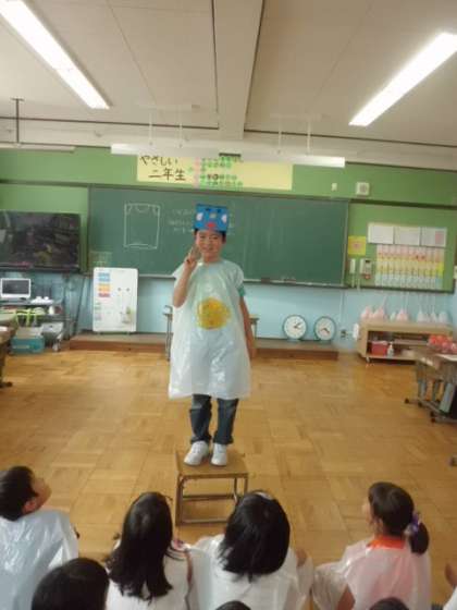 図画工作の学習で作っていたぼうしが完成しました。みんなで「発表会」ならぬ「ファッションショー」を開きました。恥ずかしそうにウォーキングをし,ポーズを決める子どもたち。一人ひとり帽子を興味深そうに眺めていました。「すごい!」「かわいいね。」「おもしろいな〜。」と思わず声を出してしまうほどでした。友達の作品の素敵なところをたくさん見つけられました。