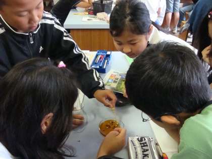 ヨウ素液を種子にたらすと、色が変わり、養分が含まれていることがわかりました。