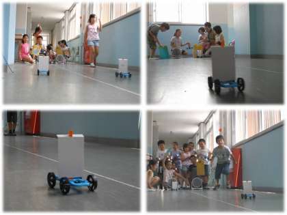 理科の学習で,強い風と弱い風それぞれを車に当てて,走る距離を調べました。強い風を当てた時は,7m,8mと進んでいったので,子どもたちからは歓声が上がりました。その後,当てる風の強さと走る距離との関係について考えました。