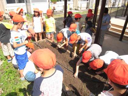 花壇にたくさん生えていた草を抜き,野菜と花を植えました。マリーゴールドやオクラなどです。夏休み明けに,成長した姿を見るのが楽しみですね。