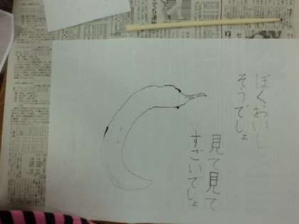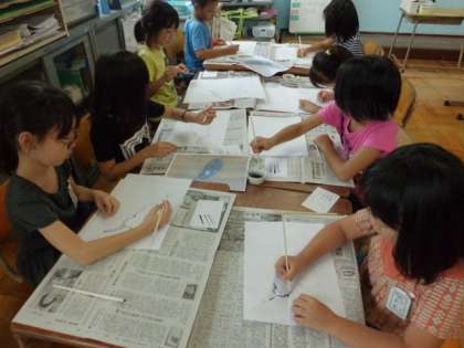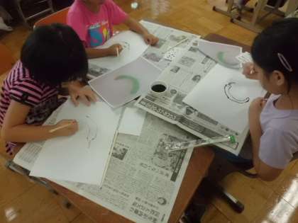 週末,保護者の方に用意していただいたわりばしペンを使って,夏野菜の絵を描きました。にじんだり,線の太さが変わったりするわりばしペンの面白さを生かして描くことができました。野菜のお隣には,ちょっとした言葉が添えられています。子どもたちから野菜へのメッセージだったり,野菜が子どもたちに話しかけていそうな言葉だったりをイメージして書きました。次の時間は絵の具で色をつけます。
