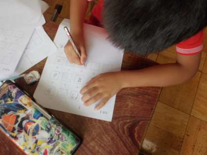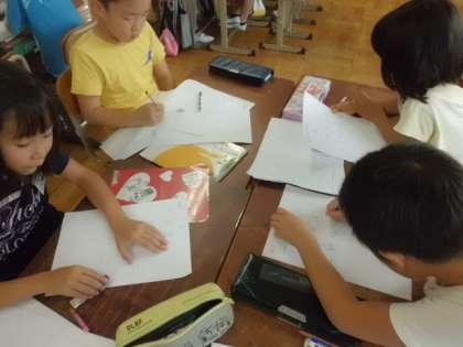 子どもたちが国語の時間につくった漢字クイズです。第1問の答えは「岩」,第2問の答えは「線」です。今日は,それぞれがつくった問題に,みんなで挑戦しました。丸つけをするのももちろん出題者の子どもたち。ちょっと先生気分を味わっていた様子でした。